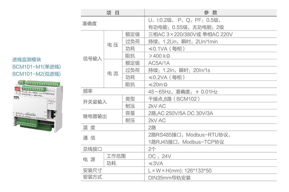 BCM101系列為交流測量。BCM系列精密配電監測單元用于監測數據中心交直流列頭柜的電力運行參數,測量進線和饋線支路的電壓、電流、電能、諧波等電參量,及所有斷路器開關狀態,具有跳閘報警功能。各輸出回路具有兩級用戶可設置的過流報警,預防潛在的電源故障。產品配置7寸彩色液晶觸摸屏,并提供以太網通信接口,方便接入其他系統。