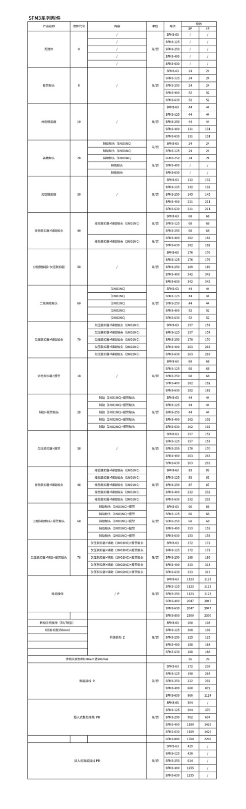 SFM3系列塑料外殼式斷路器(以下簡稱斷路器),適用于交流50/60Hz,其額定絕緣電壓至1000V,額定工作電壓415/690V額定工作電流至8OOA的電路中作不頻繁轉(zhuǎn)換及電動機不頻繁起動之用(Inm≤400A及以下)。斷路器具有過載、短路保護功能,能保護線路和電源設備不受損壞。該斷路器具有體積小、分斷能力高、飛弧短、抗振動等特點。斷路器可垂直安裝(即豎裝)也可以水平安裝。