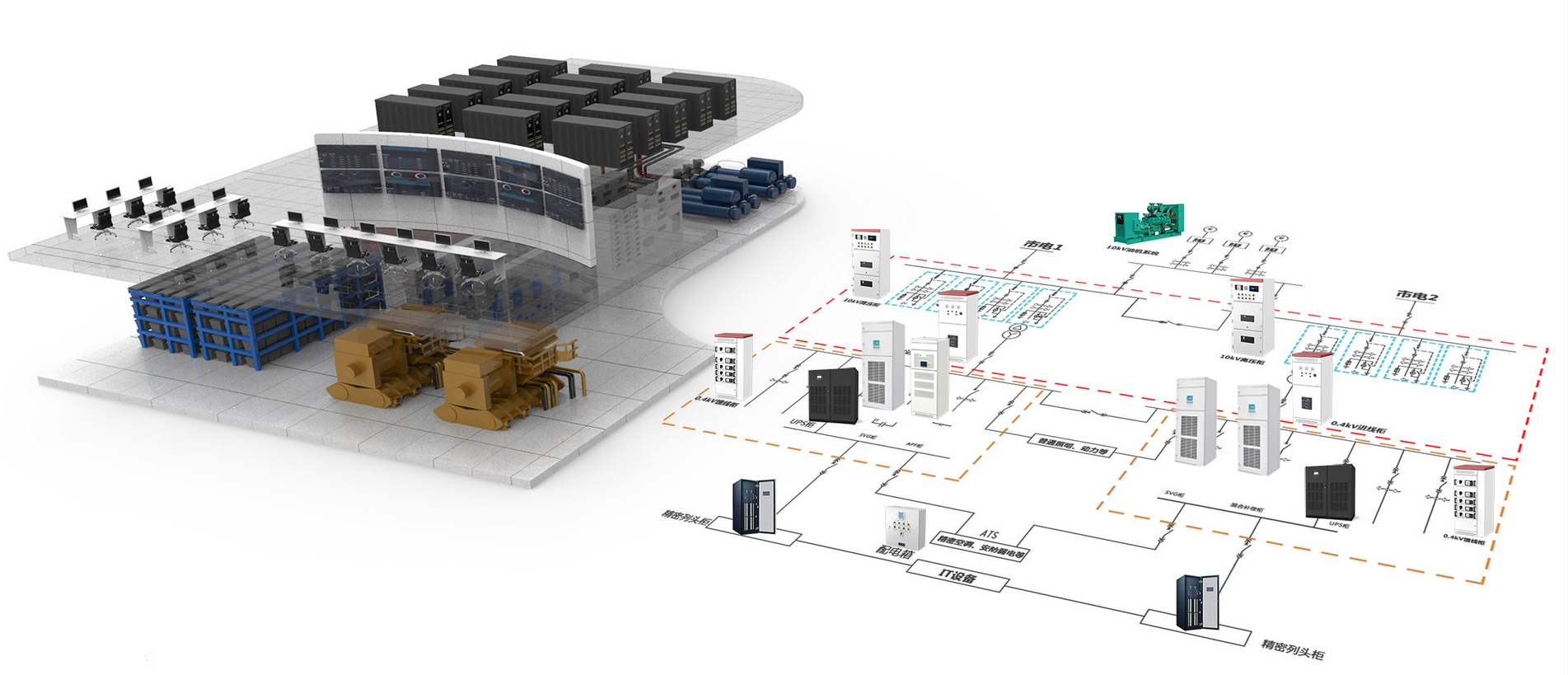 該方案主要針對數據中心的機房配電,由于機房負荷主要由UPS供電,UPS整流過程中容性無功比較大,所以采用靜止無功發生裝置,具備雙向無功補償能力,使系統保持接近為1的單位功率因數,同時可采用有源電力濾波器進行電能質量的改善,綜合解決數據中心的諧波問題,消除諧波對電力系統的危害,避免諧振風險,有效改善數據中心機房用電環境,提升機房用電可靠性。