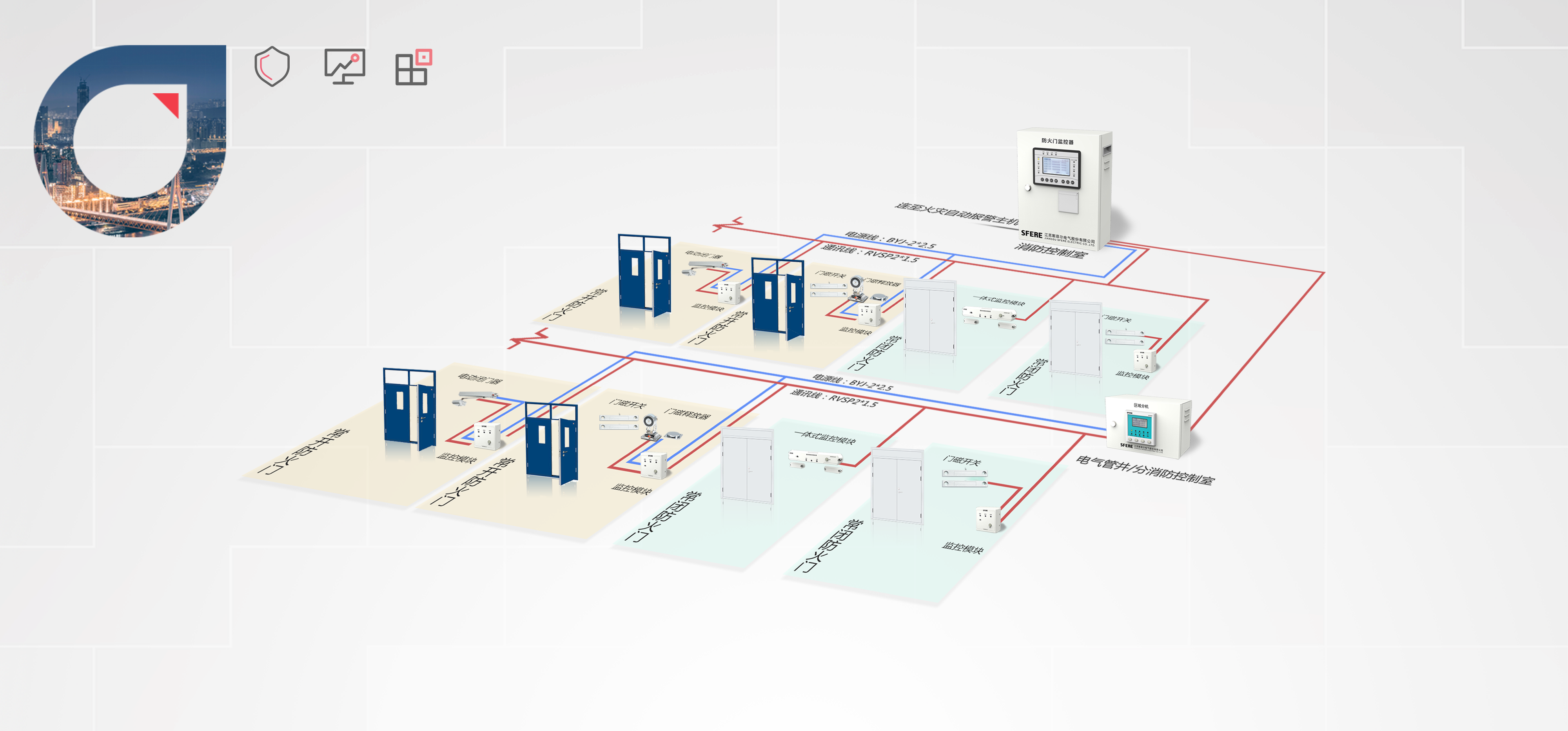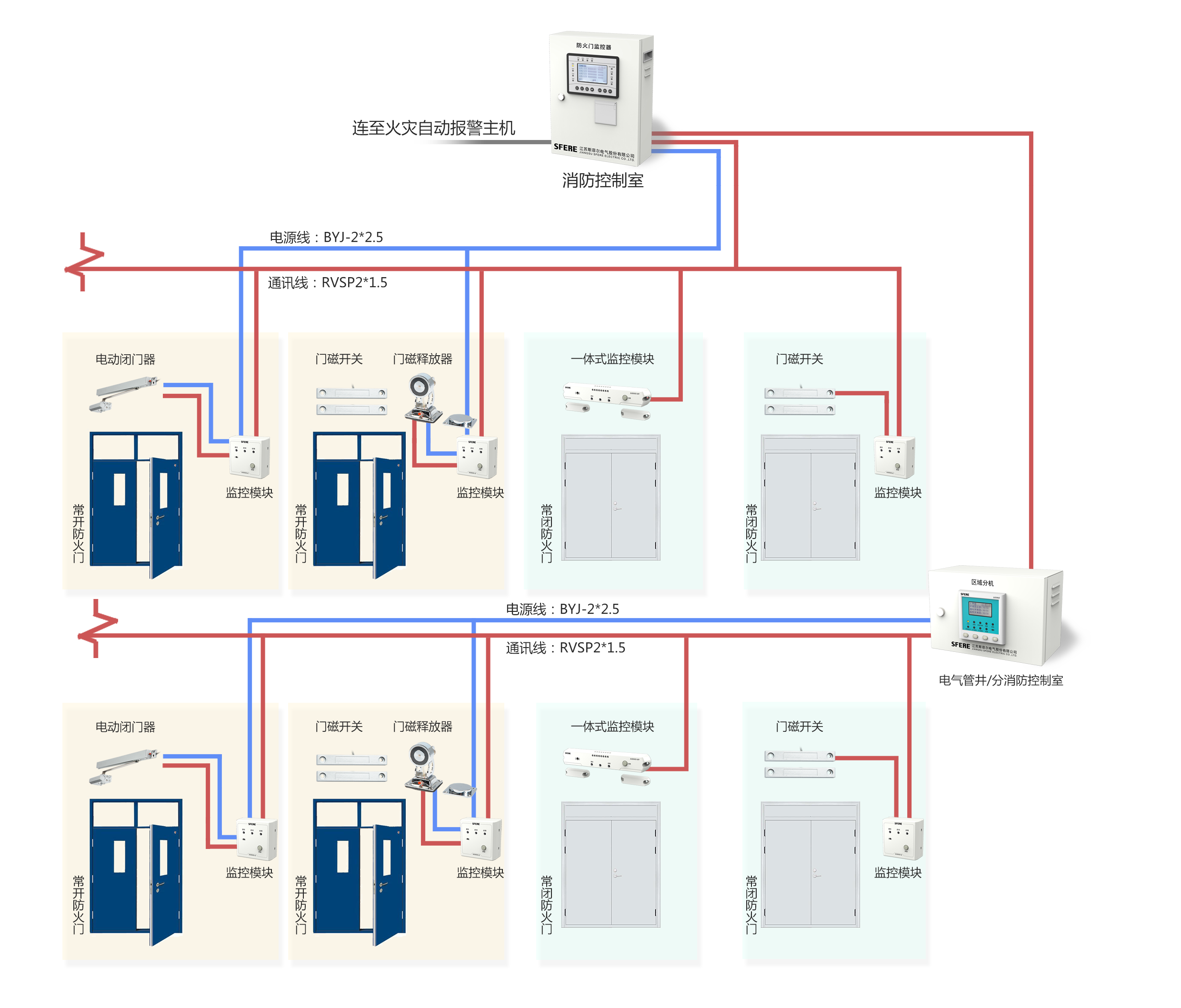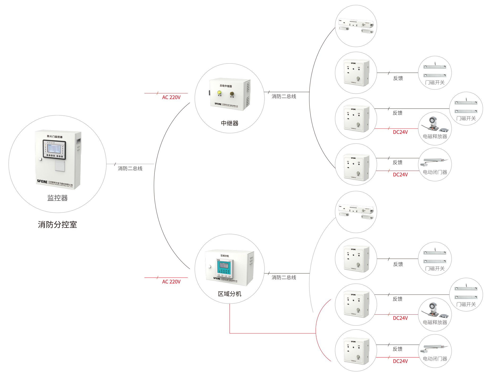 防火門監控系統由防火門監控器、區域分機、中繼器、監控模塊、門磁開關、電磁釋放器、電動閉門器、機械閉門器等設備組成。