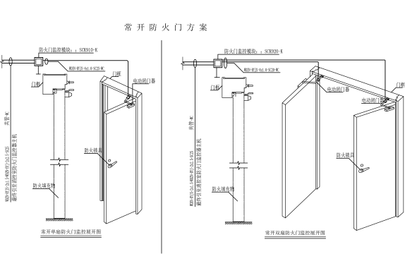 常開門采用分體式監控模塊和電動閉門器方案,即雙扇常開防火門在左右兩扇門門框處各安裝一臺BS860電動閉門器,在門旁墻體上安裝一個SCK920-K防火門監控模塊;單扇常開防火門在門框處安裝一臺BS860電動閉門器,在門旁墻體上安裝一個SCK910-K防火門監控模塊。