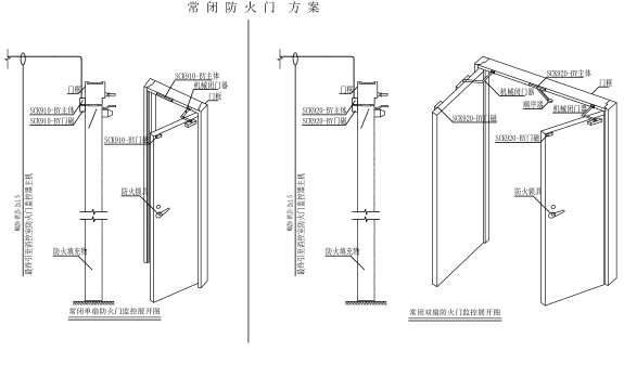常閉門配置方案常閉門采用一體式監控模塊方案,即雙扇常閉防火門在門框頂部安裝一個SCK920-BY防火門監控模塊,單扇常閉防火門在門框頂部安裝一個SCK910-BY防火門監控模塊。